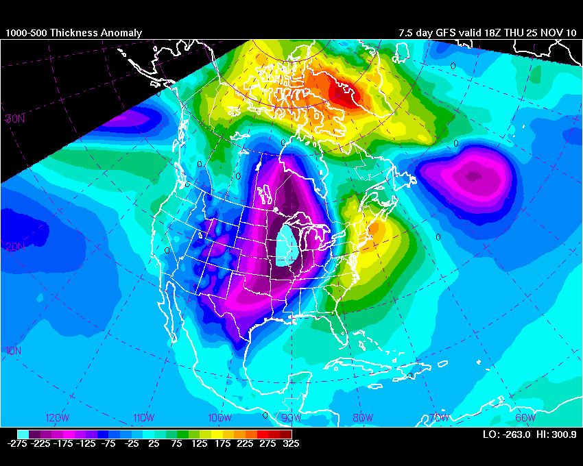 Here is a different look at the anomaly map. This is for Thanksgiving day. Those blue areas are cold! Well below normal temperatures over different heights of the atmosphere. There are some timing issues on when the cold air will arrive. Temperatures will likely be in the 60s ahead of the front. Then crash behind the front. Typical late fall cold front!
